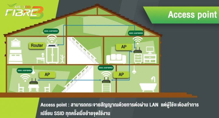 หากบ้านของลูกค้าเป็นหลังใหญ่ มีหลายชั้น และหลายห้อง ทางอินเทอร์เน็ต AIS Fiber ขอแนะนำอุปกรณ์ตัวกระจายสัญญาณ WiFi ซึ่งก็คือ Access point ซึ่งนิยมนำไปวางกระจายตามจุดต่างๆ ให้รัศมีการกระจายของสัญญาณ Wi-Fi ครอบคลุม เพื่อให้อุปกรณ์ที่รองรับ Wi-Fi เชื่อมต่อเข้ามาอยู่ใน วง LAN เดียวกัน เพื่อการใช้งานอินเทอร์เน็ตของ AIS Fiber ได้อย่างครอบคลุมทั่วทั้งบ้าน