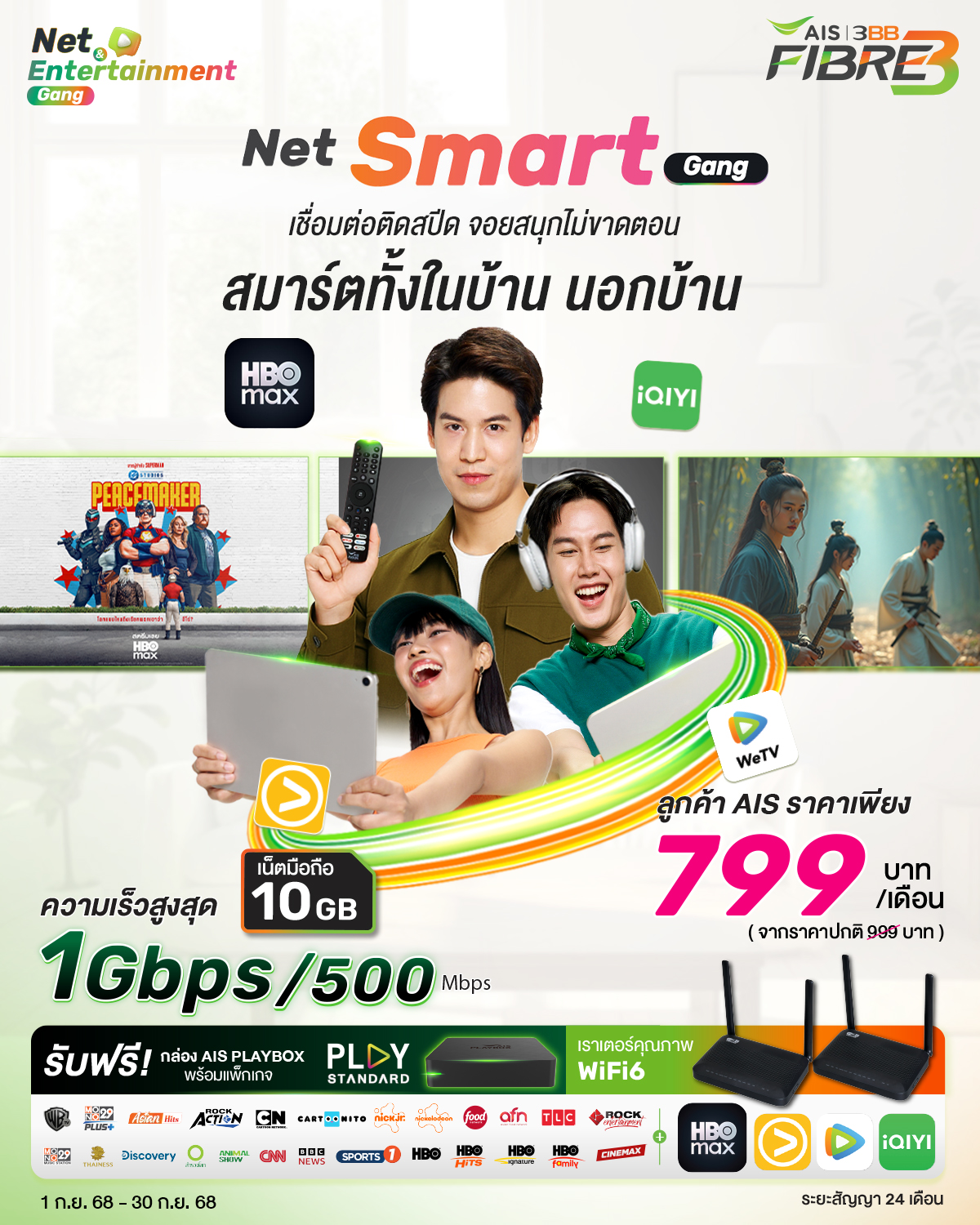 ⭐ แพ็คเกจ Net Smart Gang 1000/500Mbps. รายเดือน 999บาท/เดือน (ลูกค้ามือถือ AIS รายเดือน รับส่วนลด 200 บาท เหลือเพียง 799บาท❗️) ได้รับ WiFi Router 2 ตัว + พร้อมกล่อง Playbox 1 กล่อง + แถมคอนเท้นต์ Play Standard พร้อมซิมมือถือ 10GB (สัญญา 2ปี) ราคาเต็มจะได้ซิมใหม่ ราคาส่วนลดจะไป on top เบอร์เดิมของลูกค้า